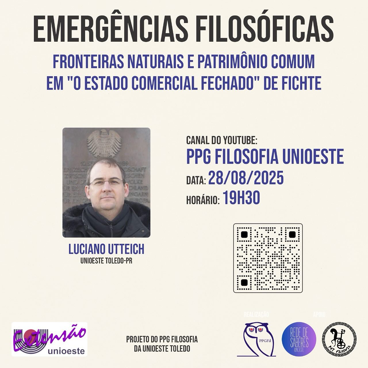 Dando seguimento aos debates do projeto “Emergências Filosóficas” O prof. Dr. Luciano Carlos Utteich (UNIOESTE) irá falar sobre a atualidade da obra de F. Fichte ‘O Estado Comercial Fechado’. “Como uma resposta que complementa o opúsculo “À Paz perpétua”, de Kant, Fichte enfatiza em “O Estado Comercial fechado” o papel da Economia com vistas a esclarecer, como causa da guerra, o conflito econômico entre os diferentes Estados”. Link para assistir pelo YouTube: https://www.youtube.com/live/GPNDA1Eytz0?si=ADbRy2C9M692b0X6