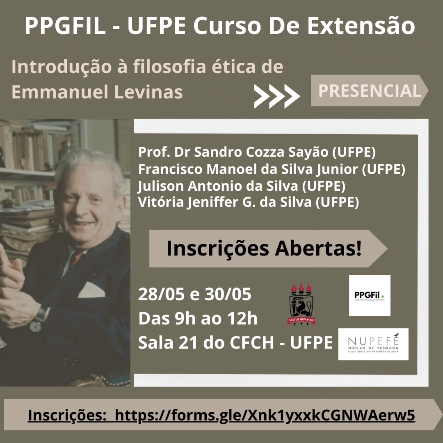 O GEPEL - UFPE convida a toda comunidade filosófica para participar do curso de extensão entitulado: Introdução a filosofia ética de Emmanuel Levinas promovido pelo Professor Dr. Sandro Sayão (UFPE). O curso tem como proposta, apresentar a filosofia de Levinas trabalhando aspectos da sua biografia, de sua fenomenologia, assim como da filosofia da alteridade, buscando apresentar e esclarecer os conceitos-chave para a compreensão do pensamento do autor.